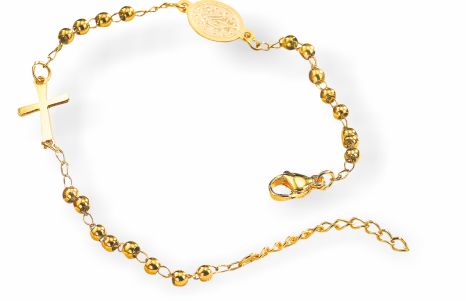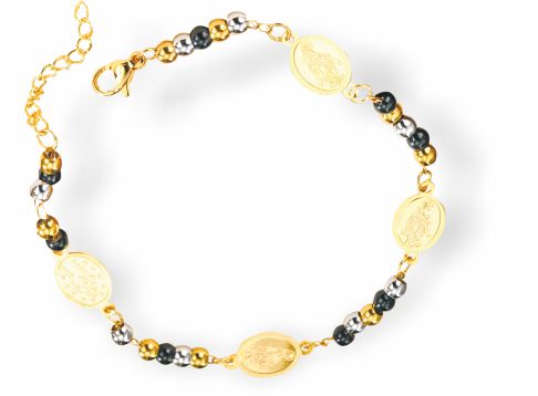 SKU: B16Original price £4.95 - Original price £4.95Original price£4.95£4.95 - £4.95Current price £4.95| /Golden Beaded Bracelet with Mother Mary Imprinted Oval Discs and extension chain. 6cm in diameter Nickel Free, Hypoallergenic