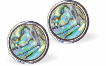 P545 - Natural Paua Shell Round Stud Earrings, Rhodium Plated