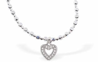 BR85 - Silver Coloured Stretch, Beaded, Slip On Bracelet, Rhodium Plated with Heart Charm