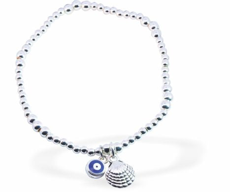 BR65 - Stretch Silver Coloured Bracelet With Mix Beads and and Devil's Eye with Shell Charms