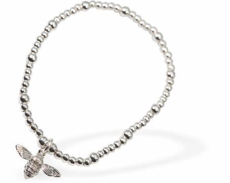 BR35 - Stretch Charm Bracelet with Silver Coloured Beads, Rhodium Plated, and Bee Charm