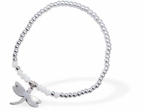 BR37 - Stretch Charm Bracelet with Silver Coloured Beads, Rhodium Plated, and Dragonfly Charm