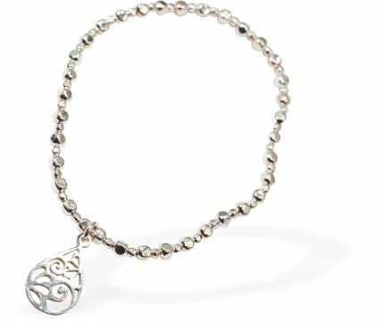 BR38 - Stretch Charm Bracelet with Silver Coloured Beads, Rhodium Plated, and Droplet Charm