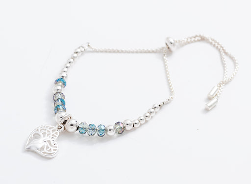BR54 - Adjustable Charm Bracelet, Rhodium Plated, with Devoted Heart Encased Tree of Life Charm and Aquamarine Blue Beads