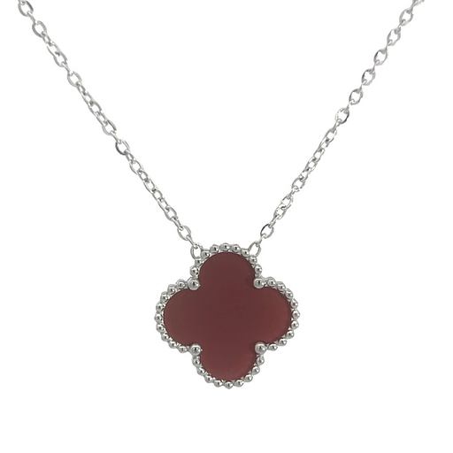 MP65 - Deep Red Four Leaf Clover Pendant Necklace, Silver Coloured