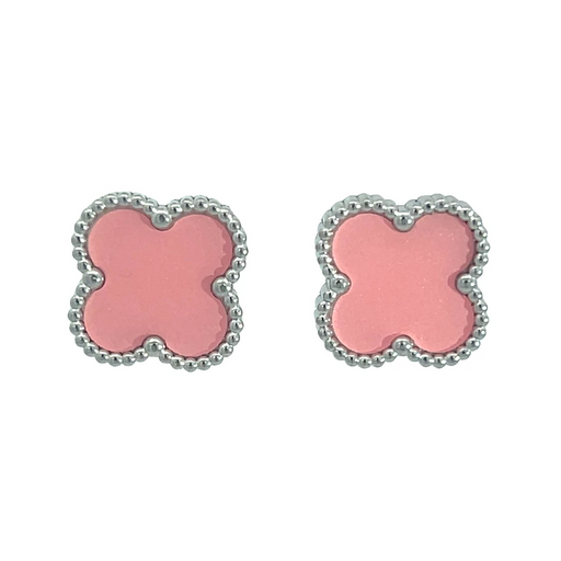 MP55 - Pink Four Leaf Clover Stud Earrings, Silver Coloured