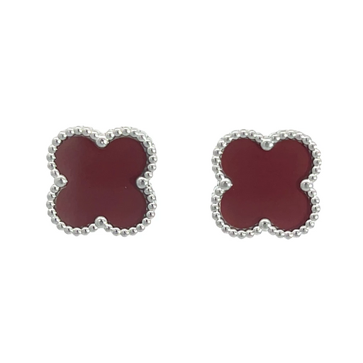MP67 - Deep Red Four Leaf Clover Stud Earrings, Silver Coloured