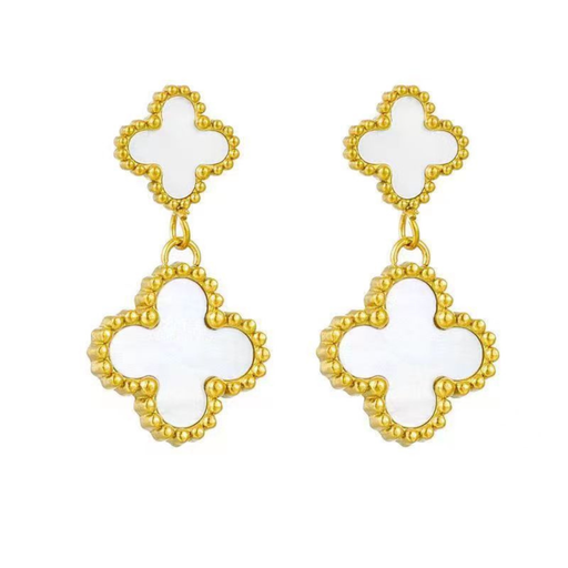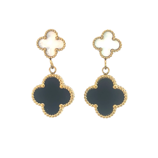 MP76 - White and Black Double Drop Four Leaf Clover Stud Drop Earrings, 18K Gold Plated