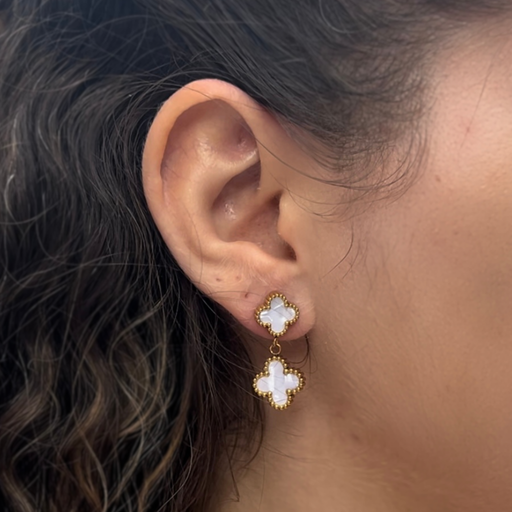 MP78 - White Double Four Leaf Clover Drop Earrings, 18K Gold Plated