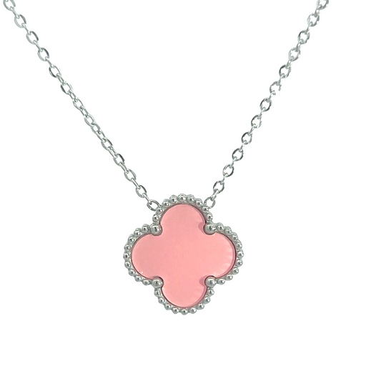 MP53 - Pink Four Leaf Clover Pendant Necklace, Silver Coloured