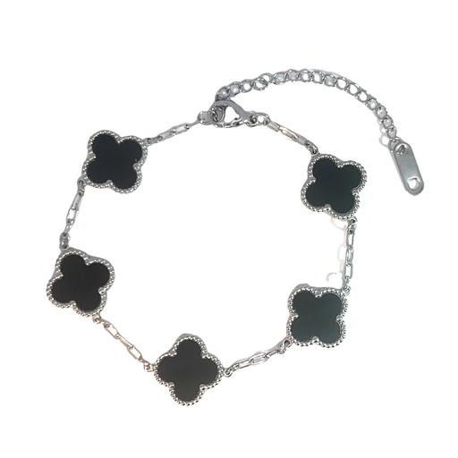 MP57 - Black Four Leaf Clover Double-Sided Bracelet, Silver Coloured