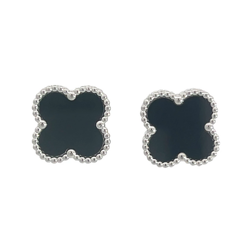 MP58 - Black Four Leaf Clover Stud Earrings, Silver Coloured