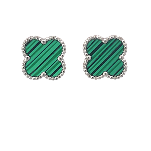 MP61 - Green Four Leaf Clover Stud Earrings, Silver Coloured