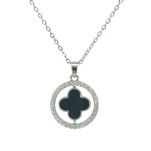 MP68 - Pave Crystal Circle with Black Four Leaf Clover Pendant Necklace, Silver Coloured