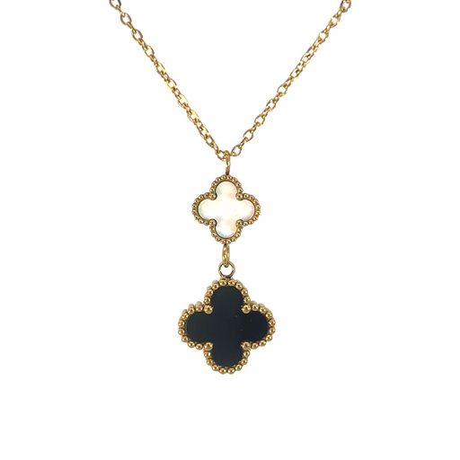 MP75 - Double Drop White and Black Four Leaf Clover Pendant Necklace, 18K Gold Plated