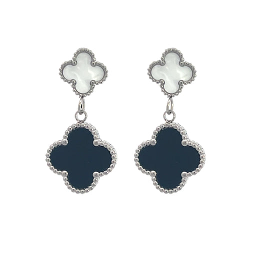 MP82 - Double Drop White & Black Four Leaf Clover Stud Drop Earrings, Silver Coloured