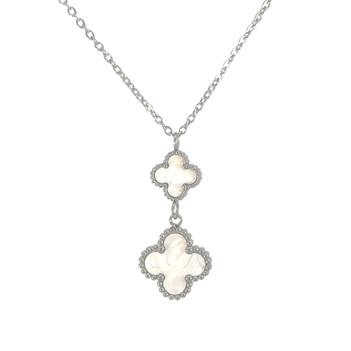 MP83 - Double Drop White Four Leaf Clover Pendant Necklace, Silver Coloured