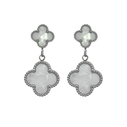 MP84 - Double Drop White Four Leaf Clover Stud Drop Earrings, Silver Coloured