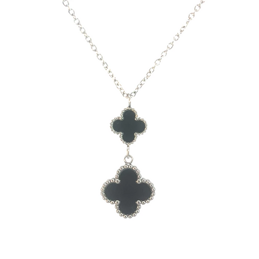 MP85 - Double Drop Black Four Leaf Clover Pendant Necklace, Silver Coloured