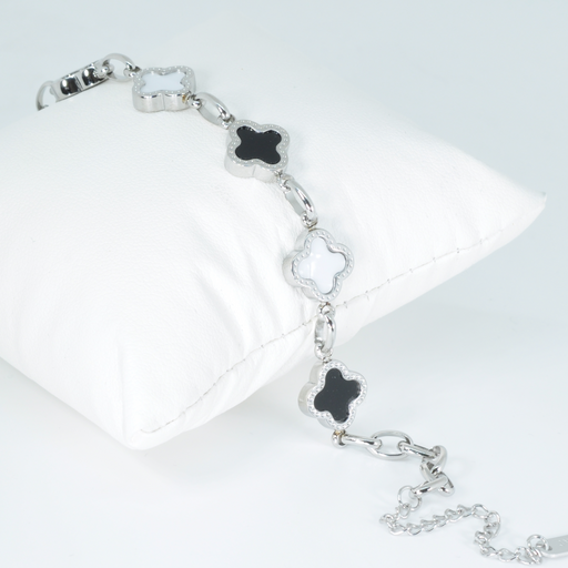 MP91 - Black and White Four Leaf Clover Bracelet, Silver Coloured