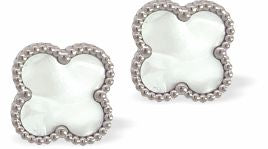 MP52 - White Four Leaf Clover Stud Earrings, Silver Coloured