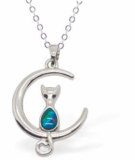 P1428 - Paua Shell Cat in the Moon Necklace, Rhodium Plated