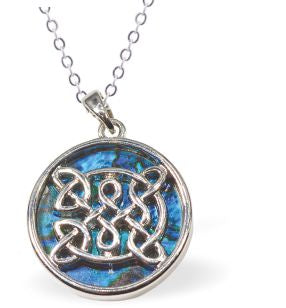 P1439 - Paua Shell Celtic Round Necklace, Rhodium Plated