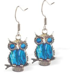 P251 - Paua Shell Tawny Owl Drop Earrings, Rhodium Plated